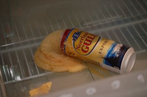 På Valborg hade vi fest här. Trevligt var det för Franssons och Vång-Molin var här och vi åt grillat och god pastasallad. Drack gott gjordes det också. Vissa av oss en aning för mycket enligt min mening (..pekar åt Fredriks håll eftersom han skulle ta hand om barnen nästa dag då jag skulle jobba med min uppgift som skulle lämnas inom kort). Vi var i alla fall en sväng till brasan och ´ungdomarna´ spelade lite fotboll. Nästa morgon hittade jag detta i frysen.. Kanske skall ha en liten gissningstävling a´la ”Vaaad kan detta vara? Ölsorbet kanske?”