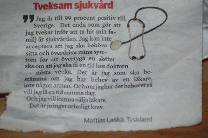 Jag tycker att det är sorgligt men träffande. Precis så upplever jag att det är när man har kontakt med sjukvården. Särskilt då primärvården. Kanske inte riktigt lika mycket när det gäller barnen som när man själv är sjuk. Nu är jag sådan som aldrig söker vård ”för att bara kolla upp” eller så. Jag vet för det mesta att jag behöver medicin eller så är jag så sjuk att jag inte vet var jag ska ta vägen typ. Möter man då en person som utgår från att man överdriver så är det ju klart att den människan tycker att man gott kan vänta ett par dagar. När man legat med 40.6 i en vecka och vet att man har lunginflammation så kan de dagarna vara ödesdigra (I know). Dock upplever jag nästan alltid läkarkontakten som positiv när man väl fått komma dit. (Då det gäller mig själv så är det ofta en ursäktande läkare som ser ut att tänka ”Vad i hela friden håller de på med där ute i växeln..?”)