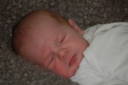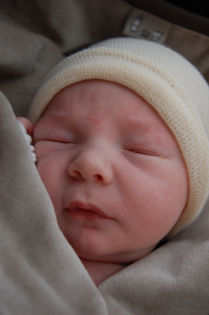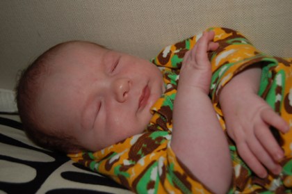 I går blev vår bebis en vecka gammal. Tiden går fort. Han har börjat vara lite mer vaken nu. Innan var inte inte mycket man fick se hans vackra ögon men nu har han börjat visa dem lite. Han har också blivit lite mer sådär.. missnöjd med att ligga själv och sova och vill helst ligga i famnen. Goooos.. Han andas fortfarande lite snabbare än normalt tycker jag men han verkar ju pigg för övrigt. En lite skum grej som jag inte tycker att jag upplevt med de andra barnen är att när man håller honom i famnen (till exempel) så kan hans ben och fötter bli helt lila i färgen. Jag antar att detta har med cirkulationen att göra på något sätt för när man lägger ner honom så kommer den normala färgen tillbaka. Den bruna lilla navelgrejjen håller på att trilla bort nu också. Jag hade egentligen tänkt att han skulle fått sitt första bad igår men det hanns inte med. Fredrik var på disputation och kom hem senare än vanligt och sedan var det så mycket som skulle fixas för jag hade inte hunnit äta, Ossian var trött för han hade inte sovit middag och sedan var det ju det där spelet som snabbare än blixten hamnade högst upp på prioriteringslistan… Vi har i all fall ett namn på g nu.. eller Fredrik har bestämt sig och verkar inte fundera mer på det. Jag tycker hans förslag bra så vi får se om vi bestämmer oss för det..