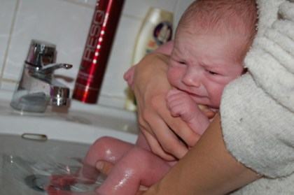 Efter maten fick bebis sitt första bad. Han tappade den lilla bruna plutten som satt på naveln igår så då tänkte jag att det skulle passa bra med ett bad. Han själv var dock inte överförtjust. Han skrek mest hela tiden faktiskt. Bilden nedan har Anton tagit.