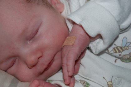 Jag packade vår lilla väska och gav oss i väg när klockan var just före tio på kvällen. Jag gick in genom akuten som vi blivit tillsagda och frågade mig fram (eller bak eller något för fel blev det). Vilse kom jag och letade runt i massor med korridorer innan jag åter var på akuten. En snäll sköterska hjälpte mig att hitta till rätt ställe och jag och bebisen blev varmt mottagna av snälla Gabriella som tog urinprov och saturation. Det var båda ua *skönt*. Efter en stund kom Thomas A och en till doktor och lyssnade och tittade och klämde och grejade. De tyckte att han var snabbandad (jasså?) men annars verkade pigg. Han var pigg också. Han låg och tittade med sina stora små ögon och vevade med armarna (och andades i hundraåttio).. Något blåsljud kunde ingen av dem höra. I alla fall bestämdes att lillbebis skulle läggas in för obs under natten för att räkna andetagen varje timme. Vi fick ett rum och snälla Jessica kom in och sa att de kunde ha bebis ute hos sig under natten så att jag skulle få sova. Jag såg nog lite galen ut och luktade gammal skog skulle jag tro. Förmodligen tyckte de synd om mig…