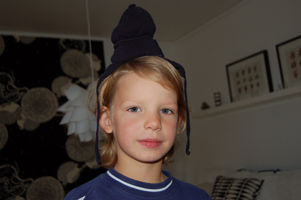 Anton provar sin allra första mössa..