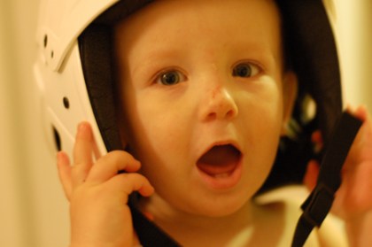 Didrik passade på att prova en hjälm i morse innan han åkte till dagmamman. Han kanske längtar till det är hans tur. Näsan är skrapad efter ett dyk under uteleken i fredags. Han såg ut som Rudolf den rödnosade regnhjorten då jag kom för att hämta honom hos dagmamman i fredags