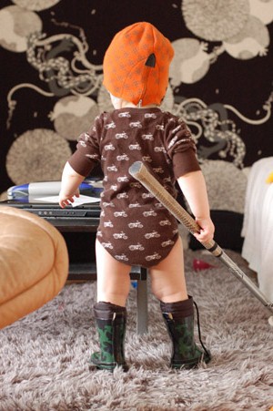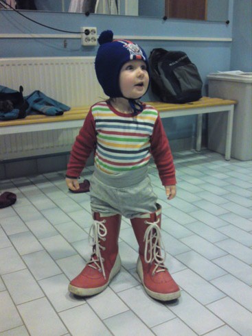 Ett foto vi sett tidigare. Fast i en annan skepnad och denna gång , bakifrån. Didrik iklädd gummistövlar, utan brallor, mössa på huvudet (min coola från Fatpipe), och med en innebandyklubba i näven. Det finns inte många andra bilder att ta på Didrik i dessa dagar. Han väljer själv.