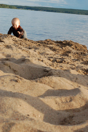 Det var ganska varmt den där dagen vill jag minnas. Didrik var tio månader gammal och ville krypa på marken och smaka på allt. Jag minns inte temperaturen i vattnet men han kröp ut en bra bit och blev alldeles våt på kläderna.