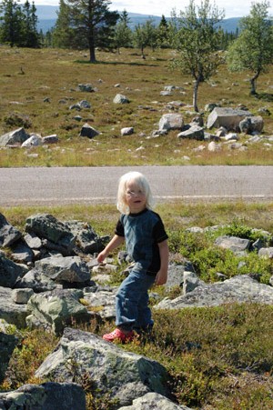 Ossian står på en fjälltopp. I bakgrunden syns fjällbjörkar.