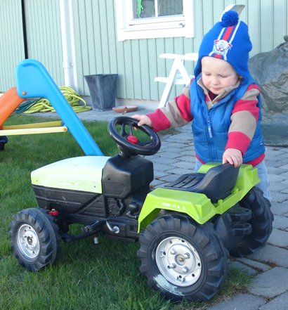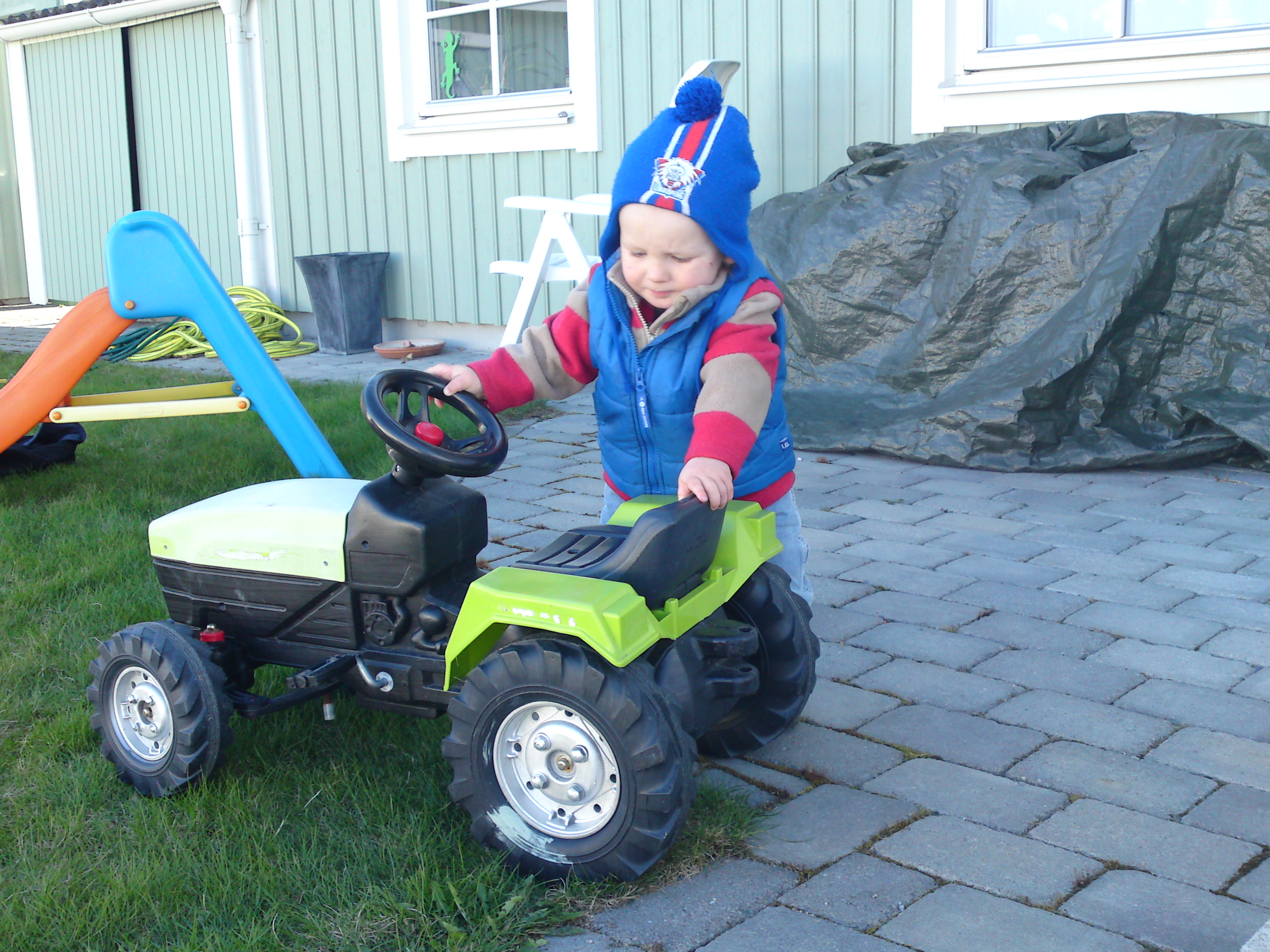 Han tycker om att vara ute just nu vår lilleman. Han vill helst vara ute hela tiden. Vid tillfället på bilden hade han gått ut själv genom ytterdörren med Antons skor på sig. Det var ett par timmar sedan. Jag fick gå ut och hämta in honom och efter det så har han tjutit och skrikit och gått omkring med skorna på fel fot och cykelhjälmen bak och fram på huvudet. Nu sover han. Utmattad.