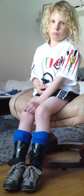 På bilden: Wilmer är påväg på sin första fotbollsträning för i år. Det syns på bilden att det är en kille med egen vilja och egna idéer. Han ville absolut inte ha benskydden på sig. Jag vet faktiskt inte varför. Han sa att de gjorde ont. Skumt. Till sist kunde han finna sig i att ha dem om han fick ha dem utanpå strumporna. Och jag är inte den som är den.