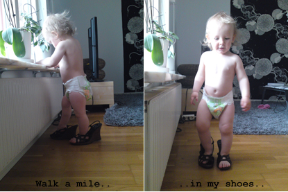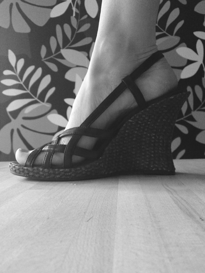 Jag kan inte bestämma mig för vad jag engetligen tycker om dem. Det är ju hippt med sådana här klackar nu igen så jag skulle kunna ha dem utan att behöva se ut att vara hopplöst ute. Det jag vet är vad jag tycker om att gå i dem. Men jag får väl lämna ungarna hemma eller hålla mig långt borta från kamphudar och farliga vägar om jag ska ha dem på mig.