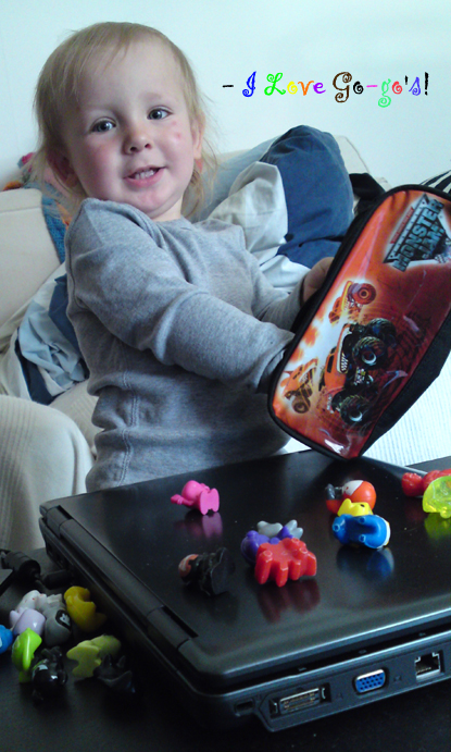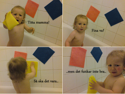 Idag hade vi nya trasor med oss hem, Didrik och jag. De stora barnen sliter sig inte från mormors och morfars hus så Didrik och jag softar själva. Vi hade fyra trasor. Jag fick en gul och fin till köket och Didrik lade beslag på tre. På simskolan har vi figurer som vi sätter fast på väggen. Jättekul, tycker Didrik. Men det fungerade inte riktigt lika bra med disktrasor. Dock fick mamman starta diskmaskinen och dra dammsugaren ett varv då gnället från badkaret inte var på grund av att Didrik tyckte att han badat klart (..och nej, han hade inget vatten i karet utan bara kranen på).