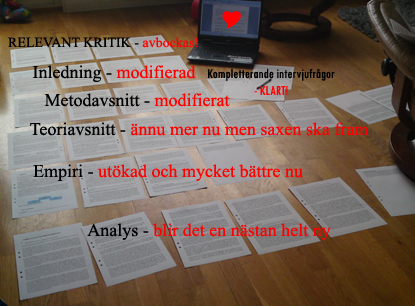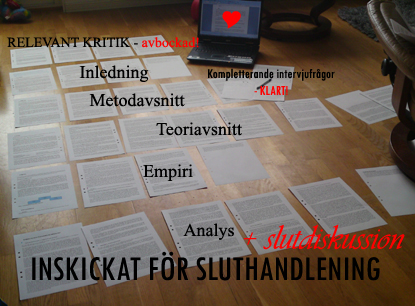 Uppsatsen som lämnades i torsdags ska in till examinatorn på lördag. Jag kan se på plattformen att vår handledare inte ens öppnat meddelandet ännu, där vår uppsats ligger. Som jag jobbade med den då. Jag var ensam ett par dagar förra veckan. Den sista veckan var det mest jag som jobbade med uppsatsen. Han jag skriver med jobbar mycket på dagar och kvällar och skulle dessutom åka till BB och göra kejsarsnitt på sin fru 😉 den dagen vi skulle lämna in. Men det gör inget. Han gjorde sitt bästa. Det är viktigast 🙂
