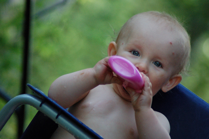 I somras var vi i Norrland. Under några dagar beskte vi vänner. Först i Luleå och sedan i Kalix. Det var ganska många myggor där. De gillade att äta på Didrik. Han verkade dock inte misstycka nämnvärt. Han fick tvätta sig sittande i sin stol. Vi ‘vuxna’ badade vedeldad bastu vilket var helgrymt. Det fanns även en sådandär tunna som husbonn arbetade hårt med att få fason på under de dagar vi var där. Men tyvärr gick han bet till sist 😉
