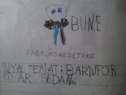 Wilmer har ritat Bun(n)e, barn för hundra år sedan och fabriksarbetare.