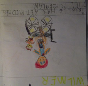 det därmed behövdes ett litet äventyr att skriva om i Trulleboken. Cykelresan hade gått bra in till staden men efter simskolan då de skulle cykla hem blev det lite för mycket. De kom hem men inte mycket mer. Ungarna frös och var trötta och grinade. Wilmer hade ju Trullboken kvar att skriva och rita i också. Ossian käkade och somnade innan han lagt sig. Wilmer kämpade och kämpade med Trulleboken. Till sist satt han och grät för att han inte orkade mer så han fick lite hjälp av mig att rita dit Trulle på pakethållaren. Egentligen åkte Trulle på pappas cykel men när Wilmer var klar med att ha ritat sig själv orkade han inte rita dit pappa.