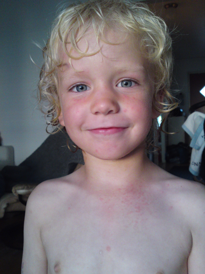 Ossian har vattkoppor. Han är lite prickig. Dock verkar det inte som att det kliar alls. Mycket märkligt men skönt. Ingen feber längre.