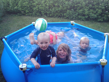 Barnen badar i poolen i trädgården innan sjukboomen.