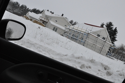 Efteråt körde jag Fredrik till universitet. På väg hem tog jag vägen förbi vårt husbygge. Det såg likadant ut som förra gången jag körde förbi där.Tog en bild genom fönstret eftersom jag ändå hade kameran med mig.