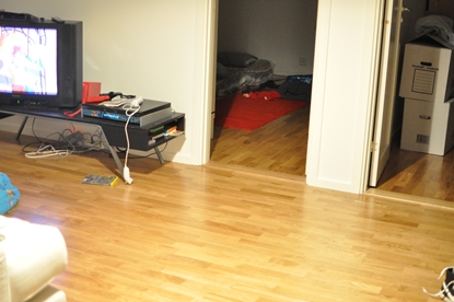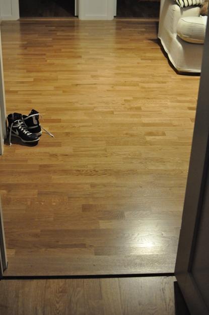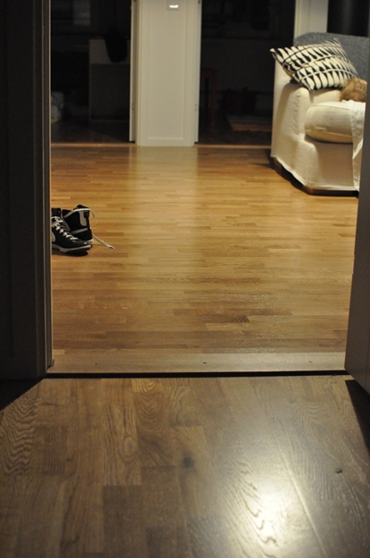 Man kan ju tycka att någon borde ha frågat oss hur vi vill ha det. Naivt nog trodde jag att man kunde ta för givet att de skulle lägga parketten åt samma håll på hela golvet. Har aldrig sett den varianten som vi har hemma hos oss nu. Det ser inte klokt ut. Som ett lapptäcke typ.