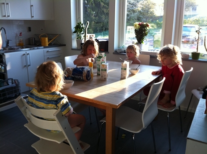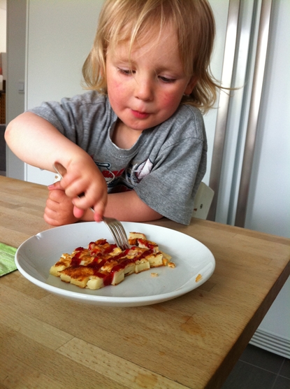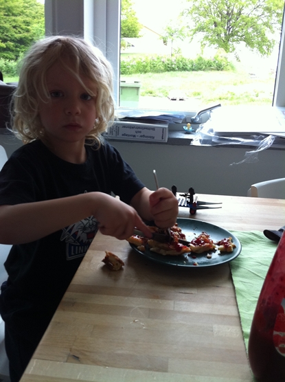 Didrik har varit jättetjurig och vrålat hela förmiddagen. Vid maten fick jag bygga ihop pannkaksbiten som jag skurit upp åt honom för att han skulle bli nöjd.