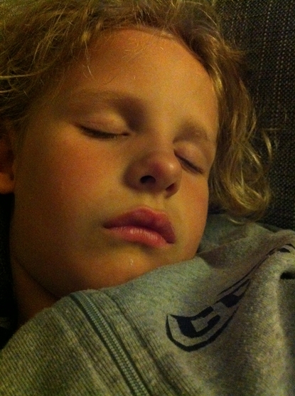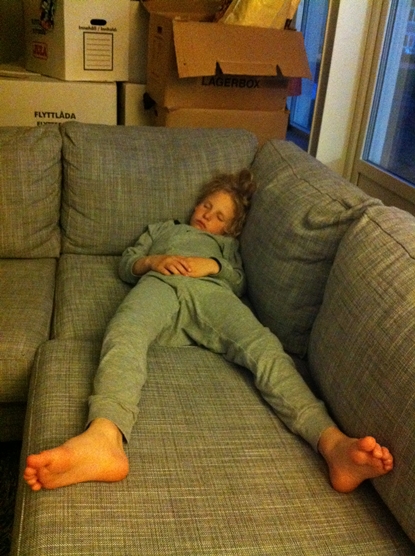 Didrik och Ossian hade avslutning för terminen på sin simskola idag. Då vi kom hem var alla trötta. Didrik fick syn på en godispåse och började vråla. Jag tycker att han vrålar väldigt mycket rent allmänt för tillfället. Han gav upp till sist och somnade på golvet. De andra barnen sover också. Anton som mådde kass i tisdags är fortfarande kvar hos mormor och morfar. Lidandet har övergått till njutning skulle jag tro men en extra hemmadag blir det av smittoskäl, Men då har vi varit RIKTIGT snälla 😉
