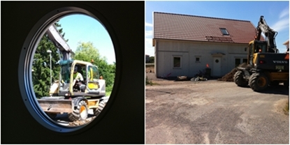 I vårt kontrakt står det att det ska ingå en stenkista i entreprenaden men för ett några veckor sedan upptäckte vi att det inte fanns någon. Då kom de hit med en liten grävmaskin och det hände en olycka. Sedan stod det stilla. Men igår kom jättemaskinen hit. Fast jag tror att den också är trasig nu för på morgonen var det en reparatör här. Den lille hämtade de i morse faktiskt och det är väl tur för igår fanns det ingenstans att ställa bilen här på vår gata.