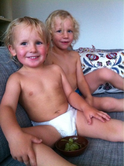 Smågrabbarna myser med vindruvor i soffan. Ett, två, tre, bajs! Det är så man blir fin på bild.