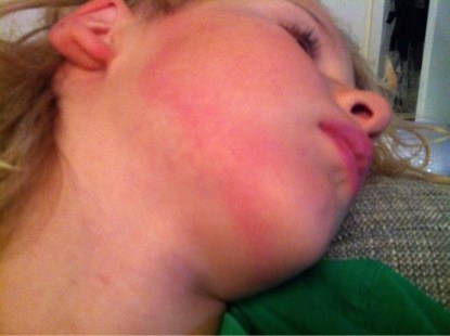 Wilmer har ett rött sträck i ansiktet som går över kinderna och under hakan. Han och fadern var på vårdcentralen idag. Läkaren hade aldrig sett något liknande.