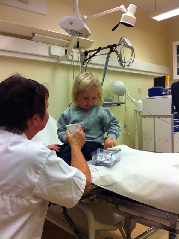 Jag ringde till sjukvårdsrådgivningen och fick åka till jourcentralen. Där fick Didrik inhalera adrenalin och så fick han kortison och lite annat. Han var skapligt sur på sköterskorna då vi skulle åka hem. Han spottade i en papperskorg i väntrummet och den stackars sjuka tjejen som bjudit honom på Läkerol tidigare fick sig ett gott skratt.