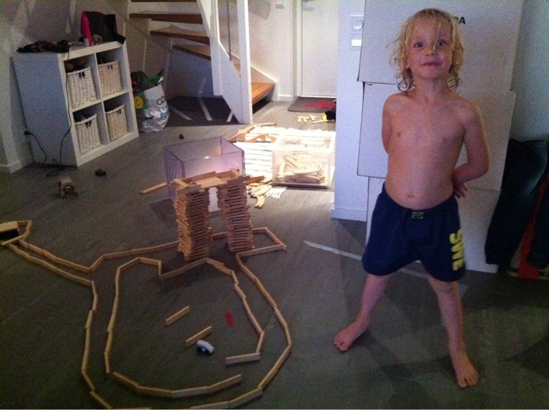Då jag kom hem från jobbet hade Ossian byggt en lång bana av kaplastavar som han fått ärva av Antons kompis. Han var väldigt stolt över den och vi har inte fått plocka undan den. Men han sover nu.