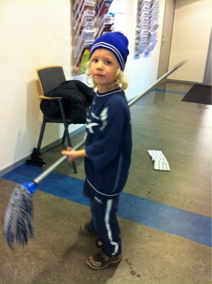 Ossian gillar att städa. Man kan ju fråga sig hur det kan komma sig att det är så. Det kan inte vara något biologiskt nedärvt för i så fall har det hoppat över minst en generation.