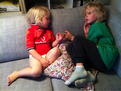 På bilden: Såhär pigga var de inte då de vaknade. Mina små sjuklingar. Wilmer hade 40 grader så honom har jag medicinerat.