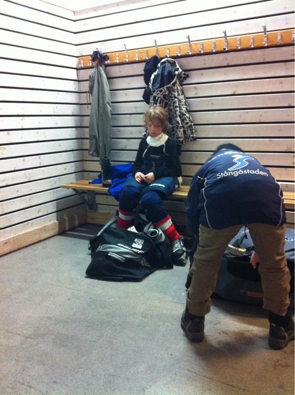 Hem och byta om. Kissa, bajsa, fotbollsstrumpor, benskydd, pannband och skyddsglasögon. Ny klubba givetvis. Mot skolans gymnastiksal. Lite för sent