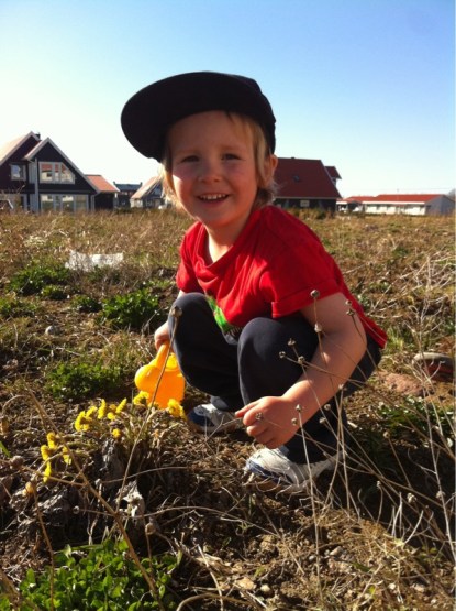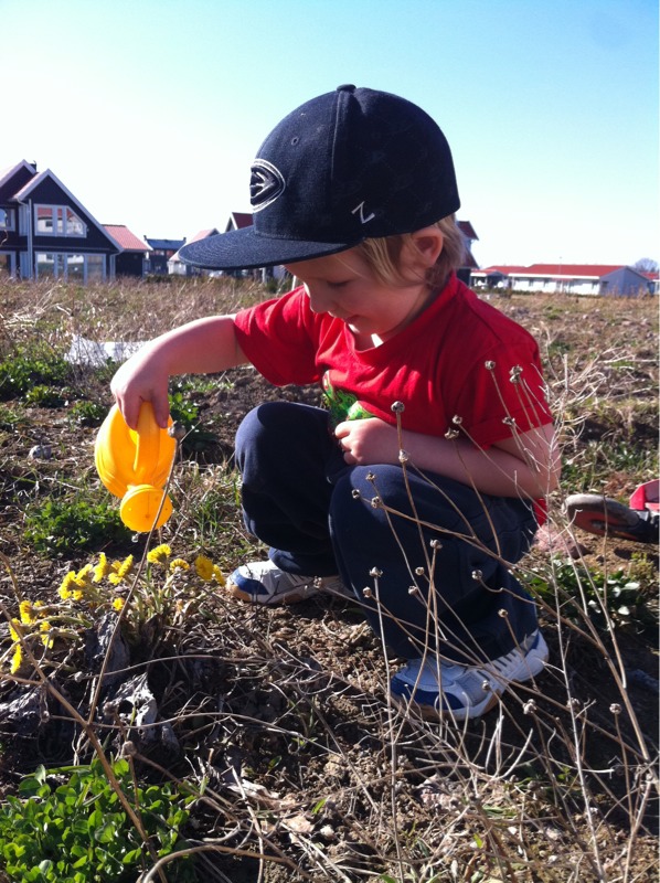 På bilden: Didrik vattnar tussilago i vår trädgård.