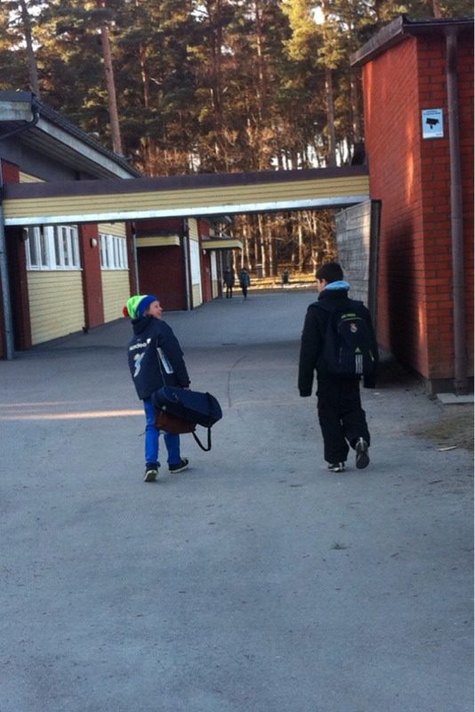 Fiolen och morfars gamla realskoleportfölj i högsta hugg. Fiolen eftersom det är lektion och portföljen full av dokument inför debatten de ska ha i skolan idag.