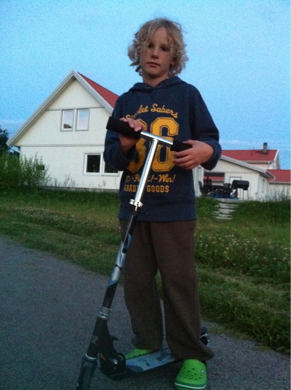 På den nya kickboarden: Wilmer i sina nya gröna Crocs.