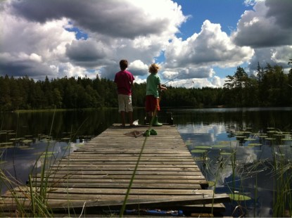 Wilmer hade också en gädda på kroken. En riktigt stor. Tyvärr hade vi inte håven framme så den släppte just då den skulle dras upp på bryggan. Men han skulle inte ha ätit sin ändå så det var nog lika bra.