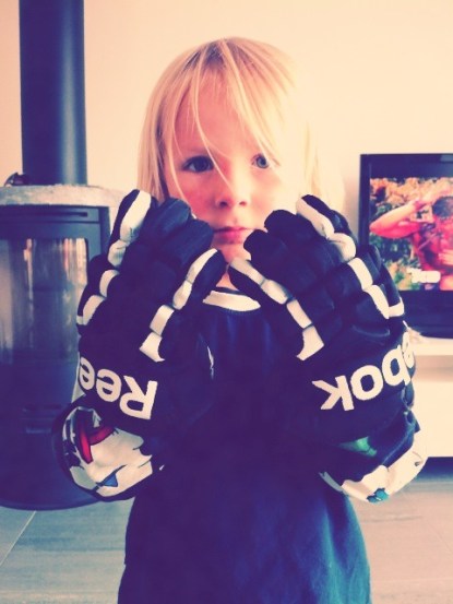 När Didrik fyllde i onsdags fick han nya hockeyhandskar. Hysteriskt små. Ser mycket större ut på bilden än vad de är på riktigt. Jag visste inte ens att det fanns så små. Tror att det är 8:or. Kan tyckas fånigt att en nybliven fyraåring ska ha hockeyhandskar men han gör små gästspel på Wilmers träningar nu. Senare i höst kommer han att kunna ses i bland på lördagmornarna ute i Ljungsbro. Fullutrustad. Tja, alla som sett honom in action förstår.