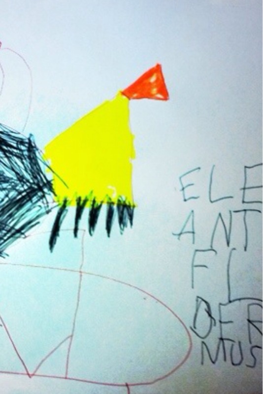På väggen på jobbet har jag vacker konst. Bland annat en elefantfladermus, en robot, en fruktskäl och en kwölpada.