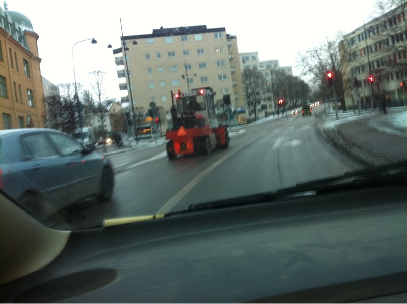 Ofattbart att man väljer trucken i morgontrafiken. Tur att man själv är i trevligt sällskap.