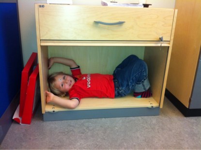 Idag har han varit med mig på jobbet. Där finns det en del kul att göra då man är fyra år. Som exempelvis spela fotboll med killen med gul tunga. Eller mysa i arkivskåpet.