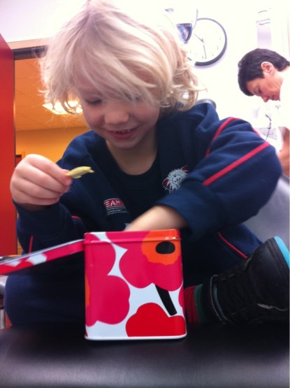 När lagningen nästan var klar vred han huvudet mot mig och frågade ”när ska vi åka hem mamma?”. Då hade han fått nog.
