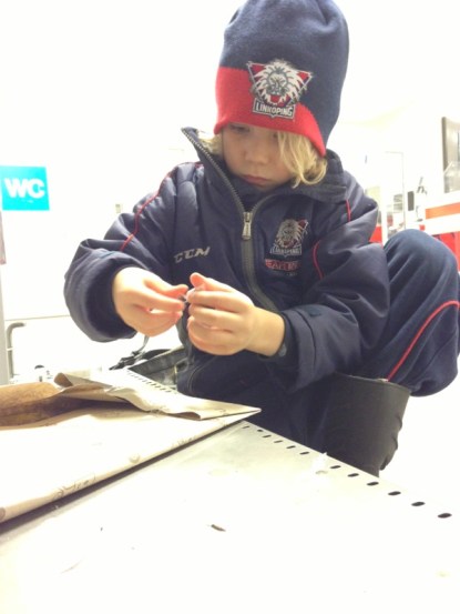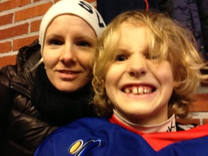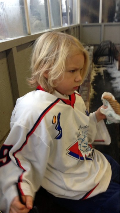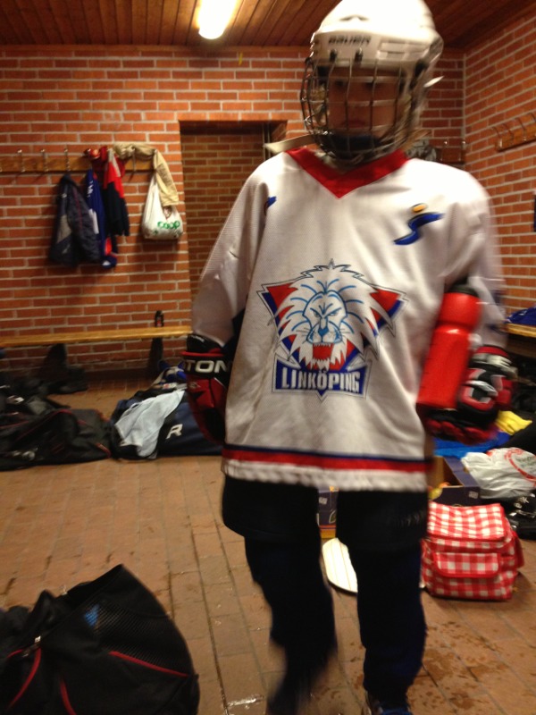 Anton ska spela hockey i den beryktade ishallen som vi smidigt lyckats undvika fram till nu. Den lär ska vara en av de kallaste i södra Sverige. Vi har klätt oss varmt.