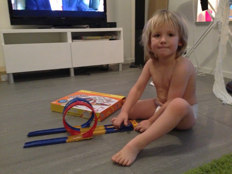 Didrik har byggt ihop en bilbana som han fick av tomten igår. Tyvärr gick den sönder innan han ens börjat leka med den. Efter fem minuters lek gick en viktig funktion sönder på den ena av de två banorna. Riktigt dåligt faktiskt. Men han är så positiv. ”Då får bara den ena bilen åka..”