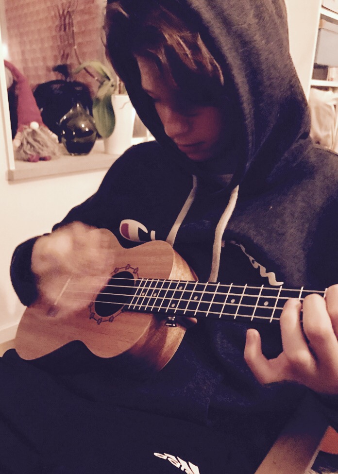 Nu spelar han på ukulelen han fick i födelsedagspresent igår. Musikalisk som få tar han sig an det instrument han får i sina händer och skapar ljuv musik. Fantastiska lilla stora människa. Grattis.