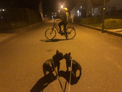 På bilden: Mörkt. Didrik cyklar. Hundarna går på promenad. En vanlig syn hos oss numera.