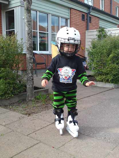 Nu på morgonen har han poserat vid webkameran i sin nya hjälm som han fick ärva igårkväll. Idag ska han åka till Cloetta Center och inviga den. I båset ::mrgreen: Han kan nog inte föreställa sig en bättre födelsedag. ‘Mina hickåå!’ springer han runt och ropar här hemma med Ossians skridskor i famnen (och nu har han även fått på dem på fötterna och går omkring!!). Tyvärr är de ju inte hans.