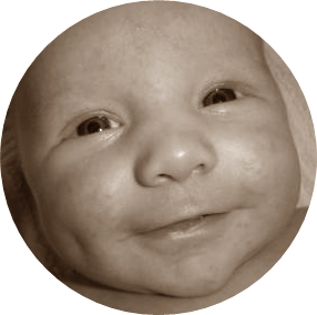 Ossian är på bilden till höger. Hans kinder var så mysiga då han var bebis. Hans kinder är fortfarande jättemysiga. Vid fototillfället var han ungefär en månad gammal. Jag hade just lyckats fånga hans leende på bild för första gången.