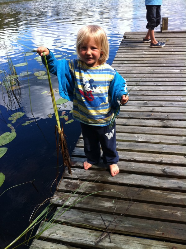 Wilmer hade också en gädda på kroken. En riktigt stor. Tyvärr hade vi inte håven framme så den släppte just då den skulle dras upp på bryggan. Men han skulle inte ha ätit sin ändå så det var nog lika bra.