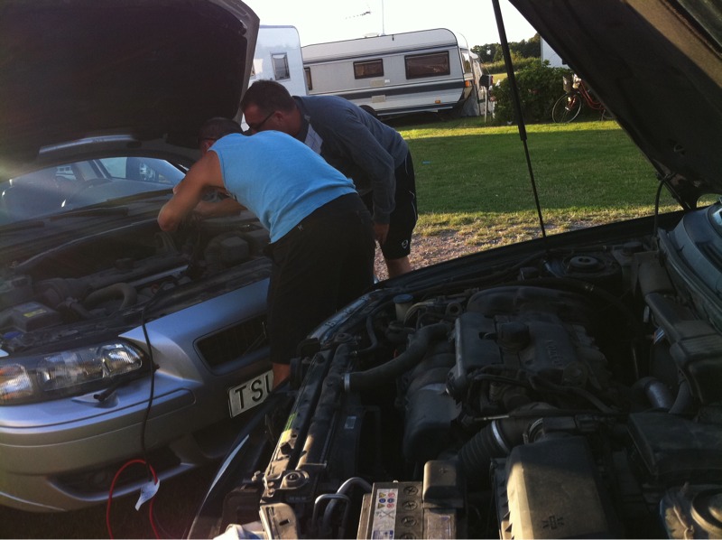 På bilden: Två snälla pappor i laget hjälper mig att starta bilen.