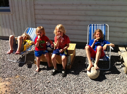 Barnen tog en glass i vår provisoriska trädgårdsmöbel på förmiddagen. (observera bordet; pall med pallkrage och lock)